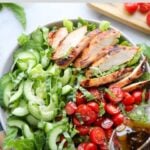 This is the best salad with turkey you’ll ever eat! Juicy marinated turkey breast is served with crunchy chopped romaine lettuce and healthy veggies. It’s a wholesome lunch or dinner salad, and a great use for leftover turkey, too!