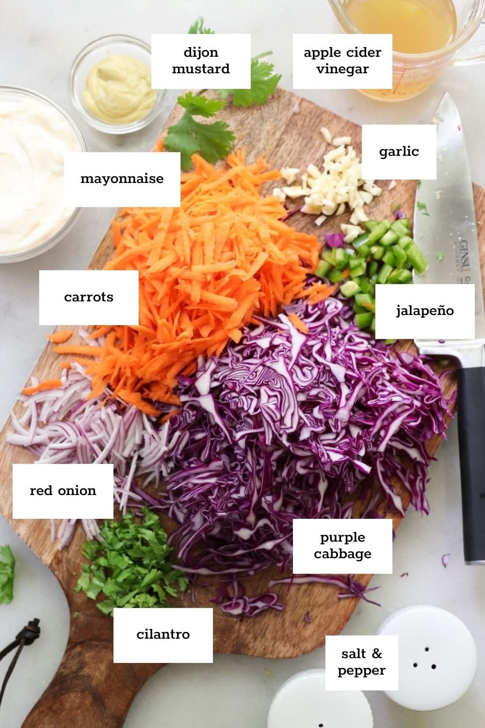 - Use a mandolin or sharp knife to thinly slice the cabbage. Use a box grater to shred the carrots. Mince the red onion, garlic, jalapeño, and cilantro.